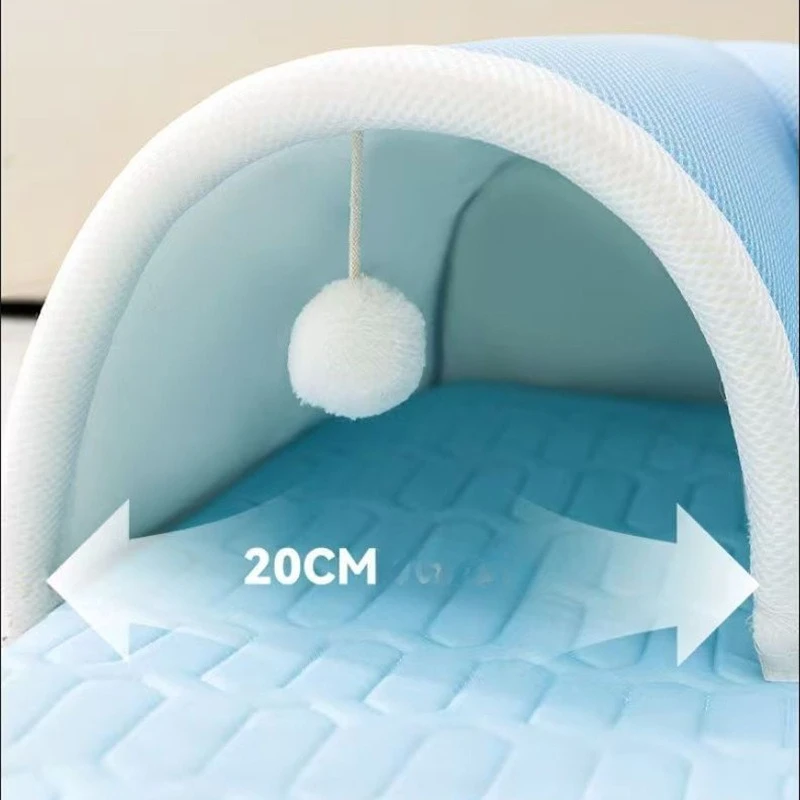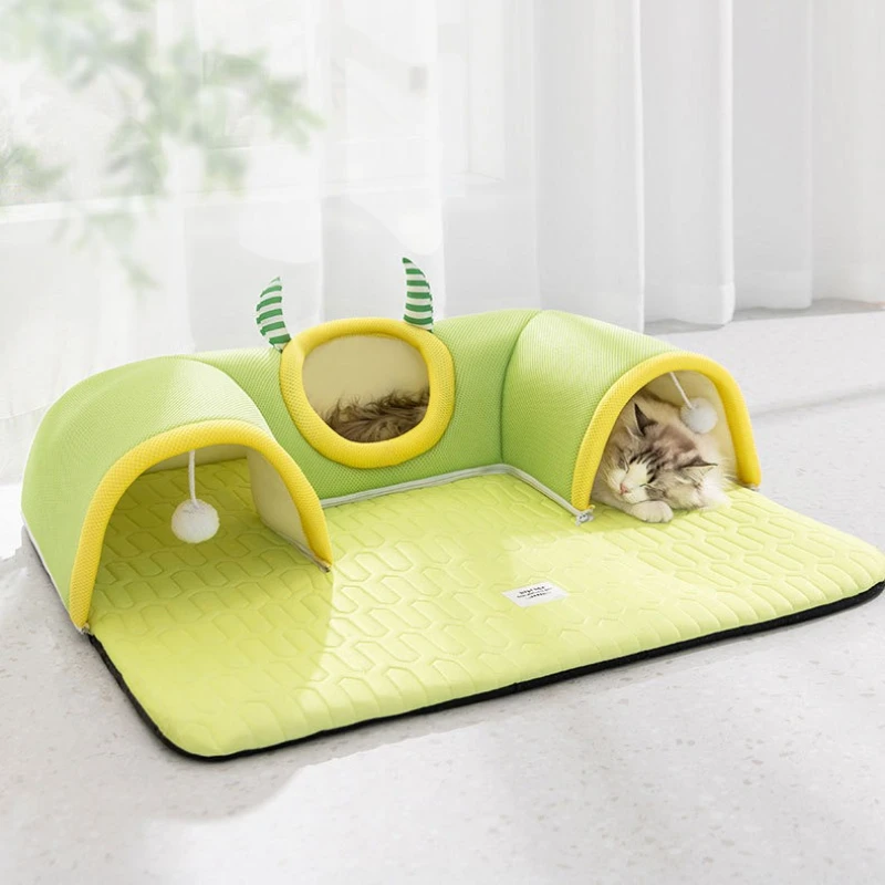 2 in 1 Feature: The 2 in 1 cat tunnel design combines a cozy cat tunnel and a soft cat carpet bed with hanging cat toys. The cat tunnel bed has a unique shaped design tunnel. Each tunnel entrance has dangling fluffy balls, bring an entertaining and exciting playtime to your cats